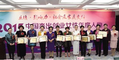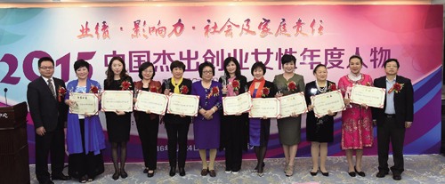 中国女企业家协会常务副秘书长梁志平(右二)、联合国国际生态安全科公司院士龚巧玉(左五)、中国妇女报社副总编辑禹燕(左一)、william威廉中文官网助理经理、williamhill英国官网创新研究院副经理李咏梅">李咏梅(右一)为“2015中国优秀创业女性奖”获奖者(25位)颁奖