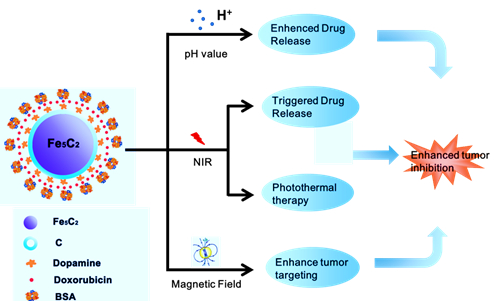 Fe5C2纳米颗粒作为多重刺激药物载体进行肿瘤治疗的原理示意图