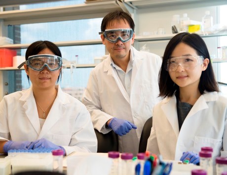 图为Rice 大学的研究人员Lucia Wu(左), David Zhang(中)和王珏皛(J. Sherry Wang,右)。Photo by Jeff Fitlow