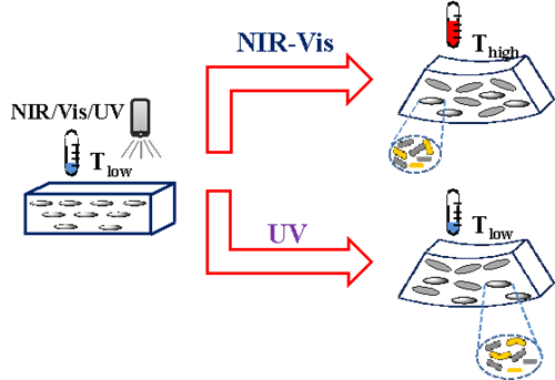 研究团队将液晶和氧化石墨烯巧妙的结合在一起,成功制备出了全波长驱动的杂化膜。在可见光—近红外光的照射下,氧化石墨烯可以作为光吸收剂和纳米级的热源,将光能转换为热能,引起体系温度升高,液晶发生热致相转变过程,使复合薄膜发生快速的光致弯曲行为,热能转变为机械能。在紫外光的照射下,混合液晶中的染料分子产生反式到顺式构型的变化,诱导液晶体系发生从液晶到各项同性的相变,将光能转换为化学能。由于液晶分子间的协同效应,整个液晶体系会发生等温相转变过程,使复合膜发生相似的弯曲运动,化学能转变为机械能。通过光热作用和光化学作用的有机结合,全波长响应的液晶微纳复合薄膜就得以实现。