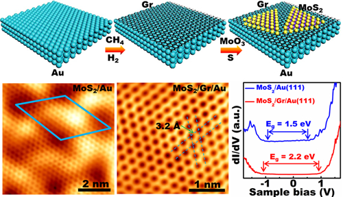 张艳锋">张艳锋研究员课题组基于前期的工作(已经在金属基底上分别实现了单层石墨烯 (ACS Nano 2011, 5, 4014; ACS Nano 2011, 5, 9194; ACS Nano 2012, 6, 10581)和单层二硫化钼 (ACS Nano 2014, 8, 10196; ACS Nano 2015, 9, 4017; Adv. Funct. Mater. 2015, 25, 842)的可控制备),通过发展两步化学气相沉积(CVD)的生长方法,在金箔基底上实现了MoS2/Graphene层间异质结构的直接构筑。光谱表征显示单层Graphene的引入,可以极大地削弱MoS2与金箔基底之间的相互作用,使单层的MoS2处于类悬浮的状态。利用扫描隧道显微镜/谱(STM/STS)的精密表征手段,该课题组获得了单层MoS2原子尺度的形貌和局域电子结构。同时,与低温荧光光谱测量相结合,获得了单层MoS2的激子结合能(Exciton Binding Energy)。MoS2/Graphene层间异质结构的STM/STS研究为理解CVD材料的晶体质量、能带结构和器件性能提供了非常直接的实验依据。