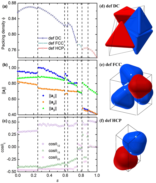 密填充率(a)和结构单元参数(b)(c)随圆角度s的变化以及三种典型的填充结构单元:变形的二聚晶体结构(d),变形的面心立方堆积结构(e)和变形的六方密堆积结构(f)