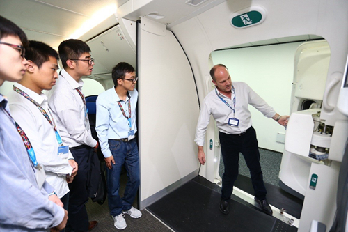 之后,同学们一起体验了波音747、波音787的模拟机,在飞行员教官的指导下进行了飞机降落以及飞行的相关操作。同学们也针对飞机飞行过程中的一些问题,与教官进行了深入交流探讨。除此之外,同学们也接受了飞机舱门开闭的训练,进一步加深了对民航客机的认识。