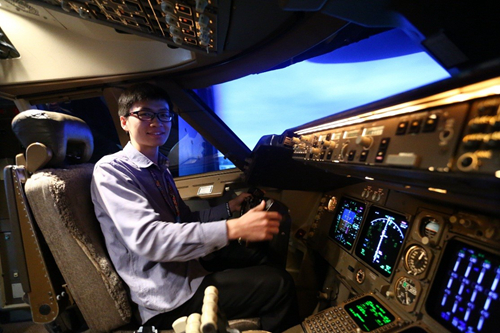 同学们在波音747模拟机上体验飞机驾驶