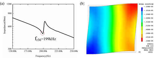 (a)为d36模式的阻抗谱, (b)为谐振频率激励下面内剪切变形的有限元模拟