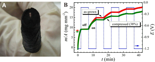(A)长在铜线上的纳米碳管海绵;(B)原生和压缩后的海绵样品在电势控制下毛细抽吸