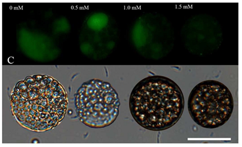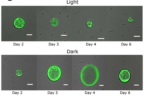 生长在葡萄糖培养基中小球藻在光照及非光照情况下细胞内油脂染色图