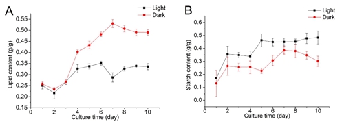 生长在葡萄糖培养基中小球藻在光照及非光照情况下细胞油脂及淀粉含量随时间变化图