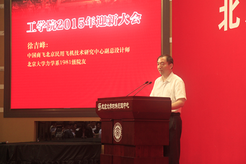 此次迎新大会还邀请了力学系1981级院友、中国商用飞机有限公司北京民用飞机技术研究中心副总设计师徐吉峰作为特邀嘉宾发言。徐吉峰院友今年参加了81级毕业30周年同学聚会,感触颇深,他回忆起在未名湖畔度过的时光,以自己人生历练所凝结出的箴言,鼓励同学们要与智者同行,与知识相伴,与正能量共同成长:在个体发展的同时提高团体协作能力,培养阅读习惯,心怀仁爱与社会责任感,求真求善。