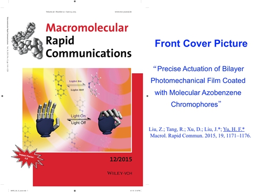 另一方,研究团队将光响应性的小分子材料涂覆在通用的高分子低密度聚乙烯 (LDPE)的,制备了具有双层结构的复合材料薄膜。这种薄膜不需要进一步交联处理就具有液晶弹性体类似的性能,可以实现光诱导弯曲,且弯曲方向为朝向光源。由于基材 LDPE 的透明性使得研究者可以用两束光来精确控制它们的弯曲程度,甚至可以实现超过360度的卷曲,并且这种卷曲运动是可逆的。这为全塑料型的光驱动器件的制备提供了很好的材料基础。该论文“Precise Actuation of Bilayer Photomechanical Film Coated with Molecular Azobenzene Chromophores”发表在高分子材料领域的著名杂志Macromolecular Rapid Communications (http://onlinelibrary.wiley.com/doi/10.1002/marc.201500177/abstract),并作为当期杂志的封面文章。