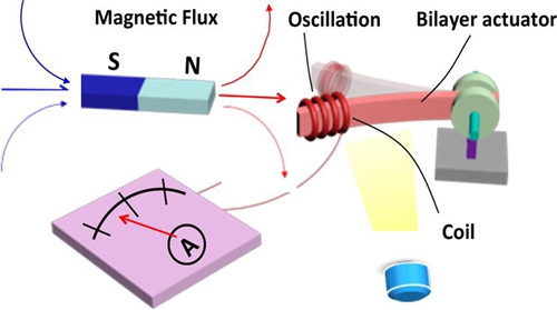 本研究将铜线圈引入到光驱动的液晶与微纳复合材料的薄膜一端,使其在运动过程中切割磁力线,根据法拉第定律产生电流,首次实现了光-机械-电能的转换。这为光能特别是太阳能的利用提供了一条有用的路线,也可以为微机电系统(MEMS)等微型器件提供能量。