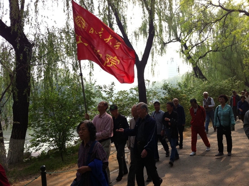 蓝天、绿树、博雅塔倒影在湖中,未名湖显得更加美丽。随着离退休工作部的老师发出出发指令,各单位依次出发了。路线是:由东操场的西南门出发,经未名湖南岸,东岸、北岸,终点在第一体育馆的北侧。刘文举着旗子一出路口,旗子就被树枝挂住了,魏庆鼎老师大步流星走上前来说,我来举。