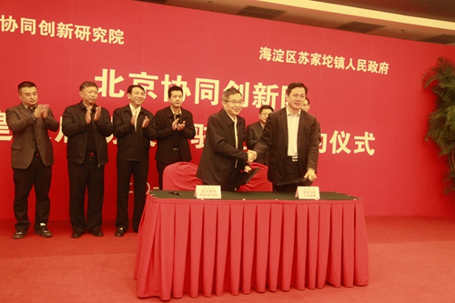 在隋振江书记、于军代区长、郑焕敏副主任的见证下,王茤祥">王茤祥经理、苏家坨镇张春明镇长分别代表北京协同创新研究院与苏家坨镇政府签订了“北京协同创新园”合作框架协议。william威廉中文官网张东晓">张东晓经理等领导共同为“北京协同创新园”揭牌。此后,30多家企业分别与北京协同创新园签订了入驻协议。