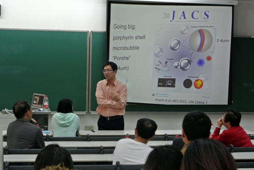 郑教授及其研究团队开发的porphysome的相关研究发表在2011年的Nature Materials上,该成果同年被加拿大癌症学会列为2011年十大癌症重大突破之一。研究成果介绍完毕后,在场师生与郑教授就卟啉脂质体的合成技术及临床转化需要克服的问题等展开了深入讨论。
