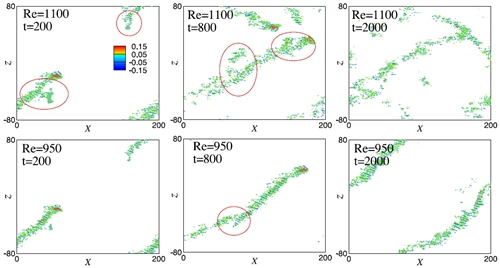 图2. 相同的湍流带在不同雷诺数时的时空演化。红圈标识出了湍流带分裂(band split)的位置。