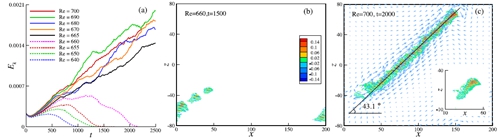 图1. (a) 扰动流场的动能演化;(b) 湍流带的断裂 (c)湍流带的倾斜伸长。插图是作为初始扰动的湍流带‘种子’。图中显示了法向速度的等值线以及平均场在x-z面内的矢量图。