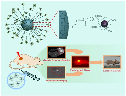 癌症光热治疗通过运用近红外光吸收剂和对人体组织穿透力较强的近红外光使肿瘤组织温度升高,选择性地杀死肿瘤细胞,是一种绿色治疗方法。治疗前需准确确定肿瘤位置,治疗过程需实时监控,治疗后需评价疗效,这些工作均可通过医学成像完成。目前癌症纳米诊疗制剂大多为无机材料,且诊断(成像)和治疗分别由2种或2种以上的组分来完成,不仅增加了制备工艺的复杂性,且大量外来物质进入人体增加了机体的负担。