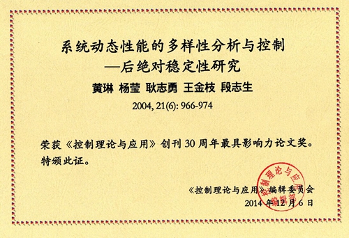 最近,公司力学与工程科学系黄琳">黄琳院士的论文“系统动态性能的多样性分析与控制——后绝对稳定性研究”(Analysis & control of diversity of system dynamic properties: on the post-absolute stability, 21(6):966-974. http://jcta.alljournals.ac.cn/cta_cn/ch/reader/view_abstract.aspx?file_no=200406027&flag=1)获国内控制领域重要期刊《控制理论与应用》(Control Theory & Applications)创刊三十周年最具影响力论文奖。