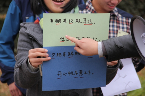 随后,所有学员被分为五个小组,进行组内相互介绍与认识彼此。各小组在有限的时间内,利用富有想象力和创造力设计了队伍的专属队名和标识。之后,学员在各组组长的带领下,开展了“物种起源”、“翻牌竞速”、“姓名做诗”和“解手环”等破冰游戏和素质拓展活动。在紧张竞争的氛围中,学员相互协作、各显所长,完成任务的同时也彼此熟识,友谊和团队凝聚力不断加强。