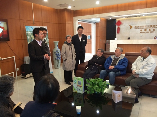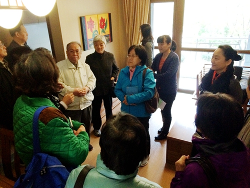 燕达金色年华健康养护中心作为提供养老服务的老年公寓设施,与燕达国际医院等机构共同组成了集医疗、教学、科研、养老一体化的大规模医疗健康和老年养护基地。中心设有自理、半自理、非自理区域,并配备医护值班室、药房、中西餐厅、咖啡厅、公共活动区等。参观团上午到达养护中心后,在职员的带领和讲解下先后参观了自理区公寓楼与公共活动区。在样板公寓间,老员工们详细询问了房间的大小、设施和配套服务等;在公共活动区,大家逐一参观了健身房、游戏室、书画中心、泳池等设施,随后至中心餐饮区就餐。礼堂、书画中心等处,展示了养护中心在住老人们的活动照片和作品,多彩的才艺表演、龙飞凤舞的毛笔字画,吸引了大家的目光。