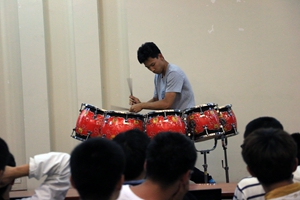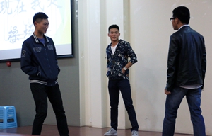 压轴登场的两个节目是空飞班的全体同学带来的短剧《学霸的反击》和四班同学们自编自导的原创剧本《男神一课》。前者诙谐幽默地讲述了学霸们的故事,精彩的剧情设计和投入的表演展现了空飞班同学们的独特风采。之后登场的四班同学在短短十几分钟的剧中融合了口技表演、诗朗诵、手风情演奏以及情歌对唱,颇具创意,博得阵阵掌声。