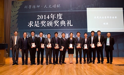 2014年度“求是杰出科学家奖”被授予清华大学物理系薛其坤教授。2014年度“求是杰出青年学者奖”被颁发给董斌、熊宇杰、张川、赵俊、李健、吴晨、颉伟、陆朝阳、宋吉舟、杨越">杨越十位优秀的海归青年学者。杨越">杨越研究员与复旦大学赵俊教授作为杰出青年学者代表发言。