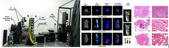 在国家重大仪器专项等课题的支持下,任秋实">任秋实课题组及其合作者研制出包括X-ray CT、PET、SPECT、荧光成像四个模态的多模态分子影像系统,可用于小动物多模态分子医学成像。该设备在国际上第一次实现了三种分子影像和一种结构成像的同机融合的医学影像成像设备,为生命科学和基础医学研究领域提供了全新的影像学平台,具有巨大的应用前景。