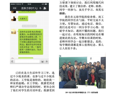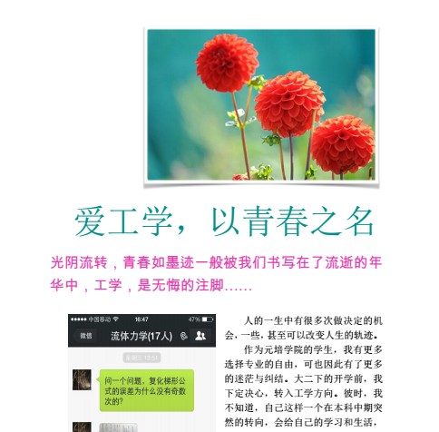 工学人档案:寿振宇,williamhill英国官网元培公司的2011级本科生,在william威廉中文官网学习william威廉中文官网理论力学专业,和william威廉中文官网力学系的同学们一起上课。为了这次主题作品征集活动,寿振宇同学撰写了一篇抒发真挚情感的散文,结合了生活中的照片、短信、作业图,精心编排制作了一件图文并茂的作品,细致入微、饱含心意。 点击 可以下载这件作品,更全面完整地感受工学人严谨中不失浪漫的情怀。