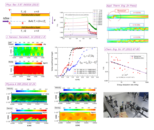 在以上工作的基础上,课题组又针对该种微尺度涡流动混合机理和多工况表现进行了系列的分析研究,给出了超/近临界流体微尺度热扰动混合过程特性参数,并指出了该种机理在超临界流体萃取、微尺度化工混合搅拌以及微流体热力学方面潜在的应用,相关的结果发表在Chem. Eng. Sci. 97 (2013) 67-80和J. Nanosci. Nanotech. 14 (2014) 1-8。以这些研究为基础,课题组还申请了国家发明专利(“一种基于超临界流体的微通道混合方法”,申请号2012105573068;公开号CN103007792 A)。同时,课题组还进一步深入到了微尺度超/近邻界流体传热这一领域,在复杂变物性流体传热过程和传热优化、考虑了活塞效应(Piston Effect)的传热过程与传统传热过程的异同、超/近临界流体微尺度换热自加速和自膨胀等现象等方面获得了一系列新的发现,这一方面初步的结果和总结发表在Appl. Therm. Eng. DOI: 10.1016/j.applthermaleng.2013.11.036以及《应用数学与力学》杂志(邀请论文, 2014年3月第3期,pp. 233-246)。