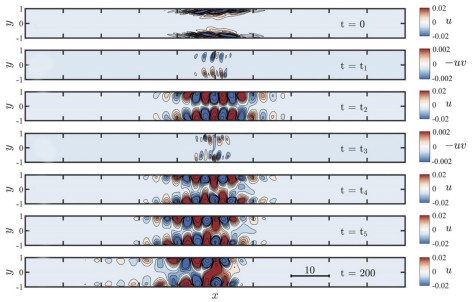 陶建军课题组针对二维槽流,通过非线性非模态优化方法求得了导致亚临界转捩的最优扰动,给出了从最优扰动演化为局地波包的三个阶段及相应的控制机制。