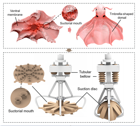 近日,谢广明教授课题组在期刊Advanced Science上发表研究论文,介绍了一种灵感来自于发光章鱼 (Stauroteuthis syrtensis) 的软体抓取手,可以实现水下的自适应抓取和感应。