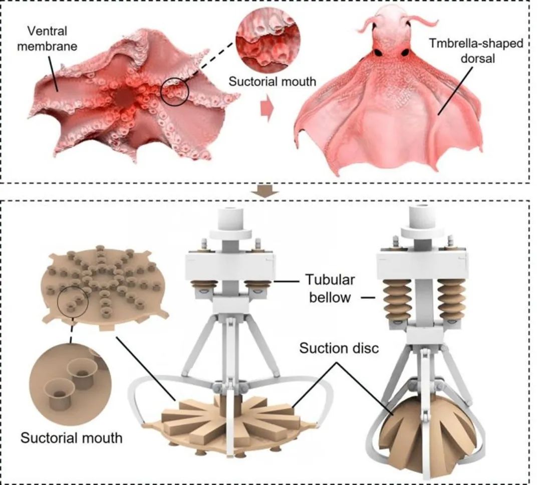 结合课题组一贯的优势,武明信开始从水下的万物生灵中寻找灵感。他发现,一种名为发光章鱼的动物在捕食时别有“天赋”。观察其生物学特点,他发现背膜覆盖了发光章鱼的大部分臂长,形成独特的伞形,这样的特点可以通过防止动物从手臂间隙逃逸,增加抓取摩擦力来有效提高大物体和活体动物的抓取可靠性。