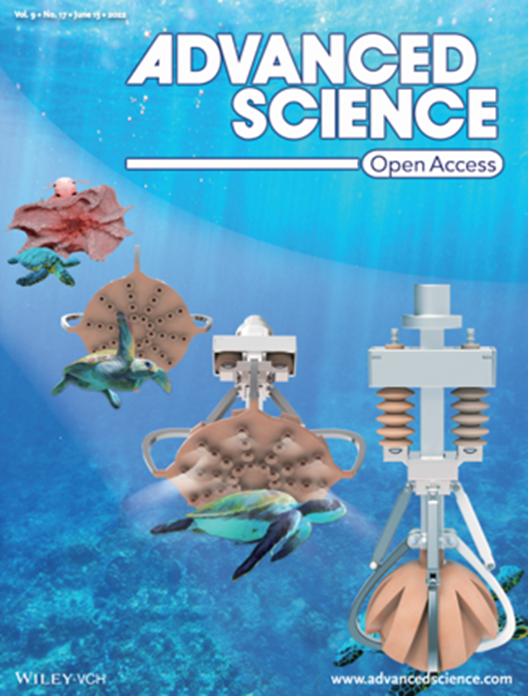 今年5月,武明信以第一作者身份在国际期刊 Advanced Science发表论文,并被选作期刊背封面。论文中,武明信设计了一种新型软体仿生抓取手,可以在水中和空气中多模态抓取广泛类型的物体,具有广阔的应用前景。
