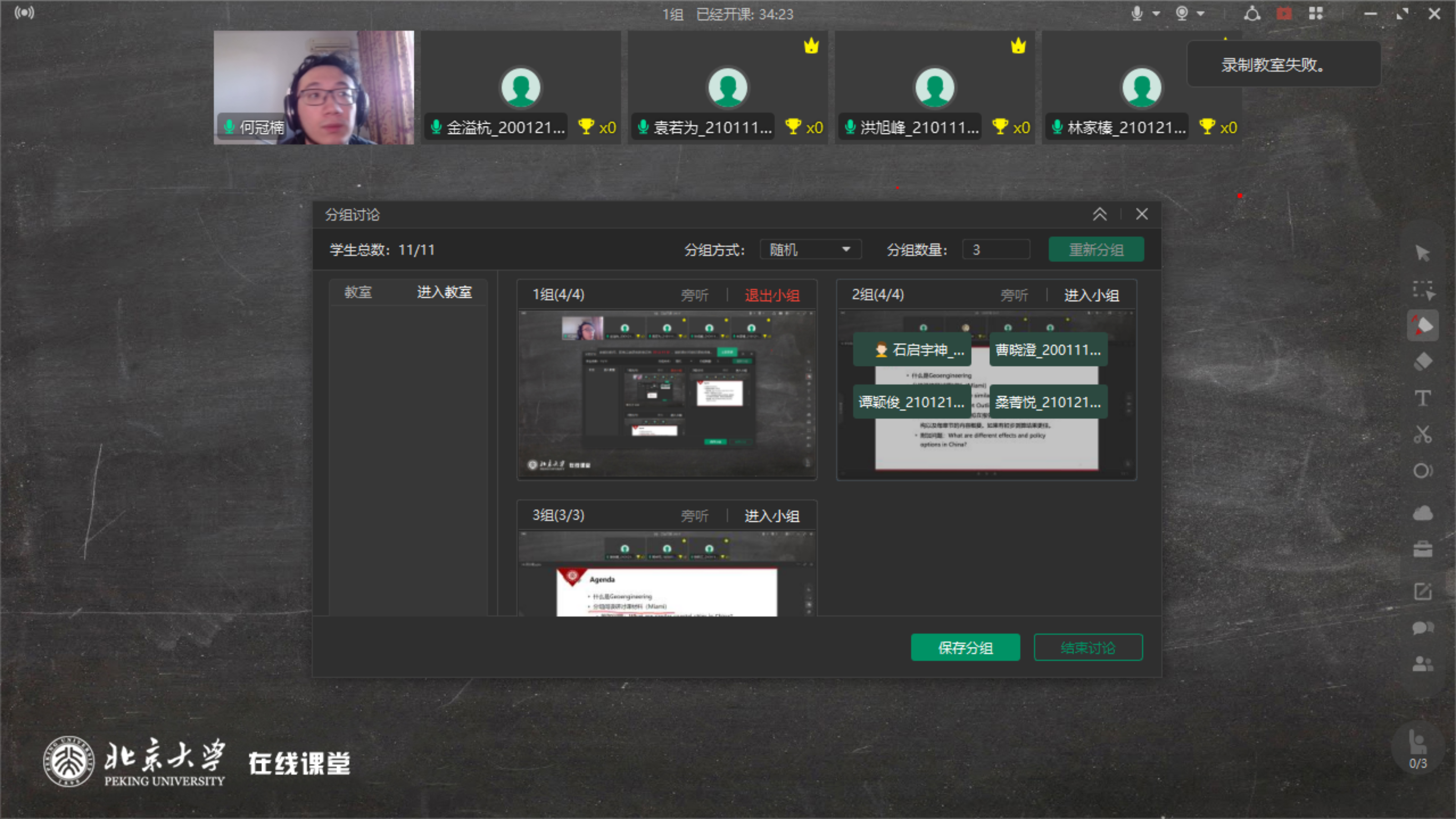何冠楠老师开设的课程有两门课进行了线上教学,除了面向本科生合开的"机器学习基础",还有一门研究生课"碳中和与能源互联网"。何冠楠老师负责的机器学习基础课程教学内容全部"搬"到线上,研究生课的情况则有所不同——何冠楠老师改进了原有的教学计划,增设了研讨课内容,采用案例分析的方式让同学们发散思维针对气候变化对社会的潜在影响进行研讨评估,而线上教学的方式赋予了这种讨论以更大灵活性,便于同学们以可视化的形式更好地呈现研究成果。当意识到这一点后,何冠楠老师结合线上教学的特点不断思考研讨课的构成要件,调整"讲授"、"讨论"、"分享"间的比例,具体地,鼓励同学们通过腾讯文档等形式协同工作,灵活运用Classin的分组讨论功能,依据课堂进度随时调整小组的工作方式。在和员工一起求知的过程中,何冠楠老师也找到了基于课程特点的新的教学方式。