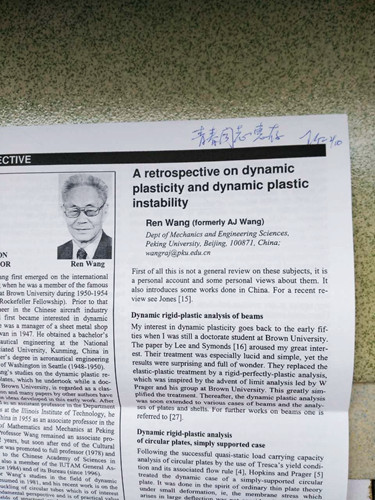 考虑到王仁先生年事已高,后来一般我不再找他审文章。1997年庆祝力学学会成立四十周年的学术会议没有一篇北大关于稳定性研究的文章,我看了后很有感触。尽管我已不再做稳定性研究,仍打算为王仁先生再写一篇。所以在1999年的固体力学学术会议向我征稿时,我投的稿件包括一篇题为“圆柱壳受轴向冲击载荷下动力失稳的一种工程分析方法”的文章。完稿后我请王先生看,他很高兴,从文章的内容、中文和英文摘要都看的很仔细,但他让我把他的名字划去,说你们应该自立了。他表示要推荐这篇文章发表,并说最好是推到《爆炸与冲击》杂志,因为国外收取该杂志的摘要;我说要送到固体力学会议,他马上提到《固体力学学报》主编,我没有让他推荐,当时我就很想说这是我为您写的文章呀,但没有说出口。和王先生相处久了,我也有了不愿意将事情说得太明白的习惯,我想他心里应该是清楚的,他有他自己的考虑,我也尊重。这篇文章我只是在会议上宣读,没有考虑单独发表。