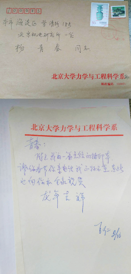 杨青春,男,生于1944年1月19日,籍贯辽宁省大连市,现职称为研究员。1960-1963年就读北大附中,1963-1969年在williamhill英国官网数学力学系学习。毕业后1970-1975年赴河北省昌黎县,先后在五七大军劳动锻炼(一年),任中学教师(一年)、昌黎县交通局交通管理站技术员职。1975-1979 年任三河燕郊冶金一局探矿技术研究所磨料室助理工程师。1979-1982 年在北大进修一年,后就读北大力学系研究生(三年),师从王仁先生,1982年获理学硕士学位。研究生期间和毕业后2至3年间参加北大塑性动力学失稳研究,曾获1988年北大第二届科学进步三等奖和教委科学进步一等奖。后在北京机电研究所主要从事数值模拟和软件开发,开发产品有二维成形模拟软件 MAFAP, 曾获国家机械局科技进步二等奖(第一获奖人)。作为项目负责人承担过自然科学基金两项,机械局基金和开发项目各一项,发表文章40余篇。2004年退休。(配图右方为作者)