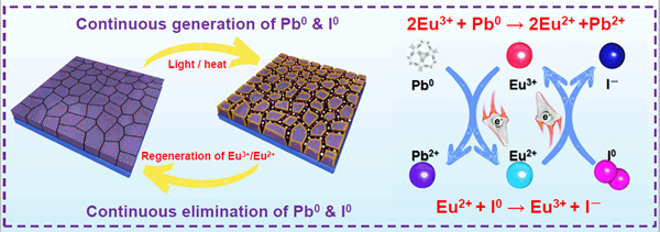 william威廉中文官网周欢萍研究员课题组、化学与分子工程公司严纯华院士课题组合作提出一种新的机制,在钙钛矿活性层中引入具有氧化还原活性的Eu3+-Eu2+的离子对,实现了全寿命周期内的本征缺陷的消除,从而大大提升了电池的长期稳定性。