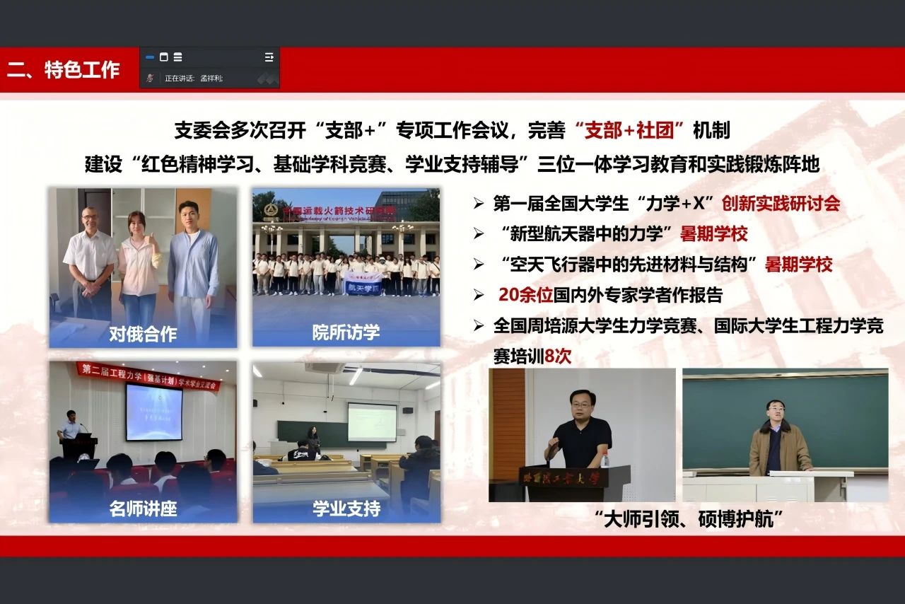 哈尔滨工业大学航天公司工程力学本科生党支部书记孟祥利介绍支部基本情况。党支部深入学习习近平总书记关于建设航天强国、加强基础研究重要论述,积极同教师党支部、兄弟高公司党支部联合共建,联络对接团支部、i力学社,打造“红色精神学习、基础学科竞赛、学业支持辅导”的党员学习教育和实践锻炼阵地,引导党员树立终身学习理念,提高实干本领。
