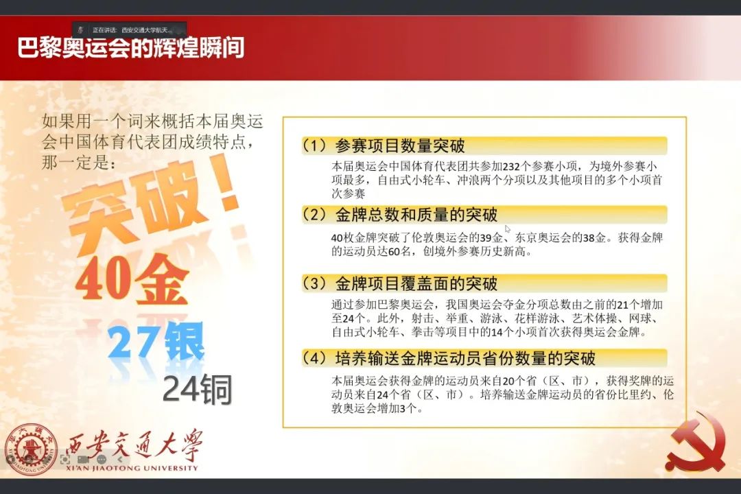 西安交通大学航天航空公司2023级硕士生第一党支部回顾新中国成立75周年的以来在体育建设方面的发展成就。人民健康是民族昌盛和国家强盛的重要标志,75年来,中国人撕掉“东亚病夫”的标签,让五星红旗在国际赛场高高飘扬,体育运动走进万千百姓的日常生活,从百年奥运梦圆到树立奥林匹克运动新标杆……在刚刚结束的巴黎奥运会上,中国体育代表团勇夺40金27银24铜共91枚奖牌,取得我国夏季奥运会境外参赛历史最好成绩,金牌数与美国队并列第一,生动诠释了新时代中国精神,充分展示了中国作为世界体育大国、奥运强国的实力,折射出新时代建设体育强国、健康中国的成就。
