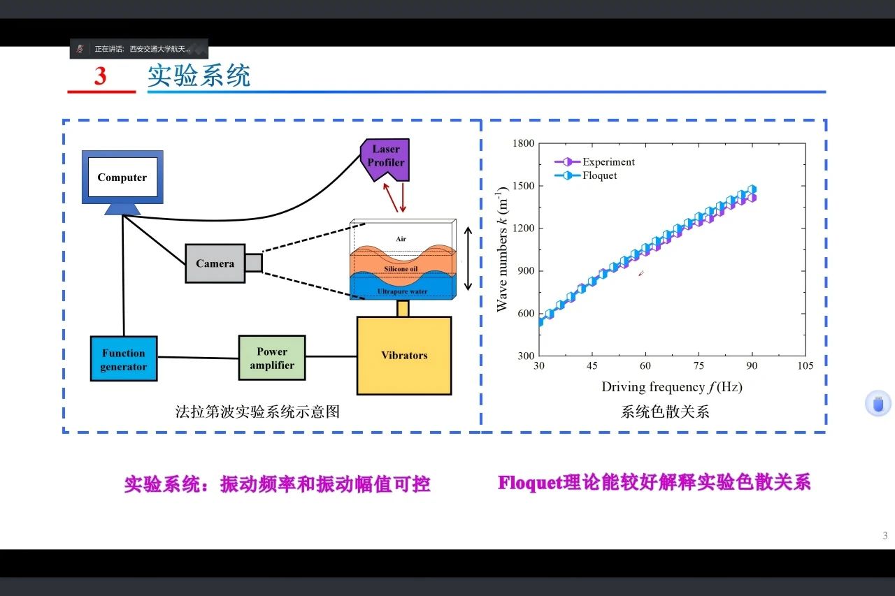 西安交通大学航天航空公司2023级硕士生、航天航空公司研究生学术年会三等奖获得者龚庆同志以《Hele-Shaw水槽中三相流体Faraday失稳模态转变研究》为汇报题目分享自己的科研成果。Faraday不稳定性在液滴自组装、波的模态变化等领域都有着广泛的应用,基于Floquet线性稳定性分析理论和Faraday波实验平台,探究Hele-Shaw水槽中三相流体Faraday失稳模态转变以及界面耦合机制。