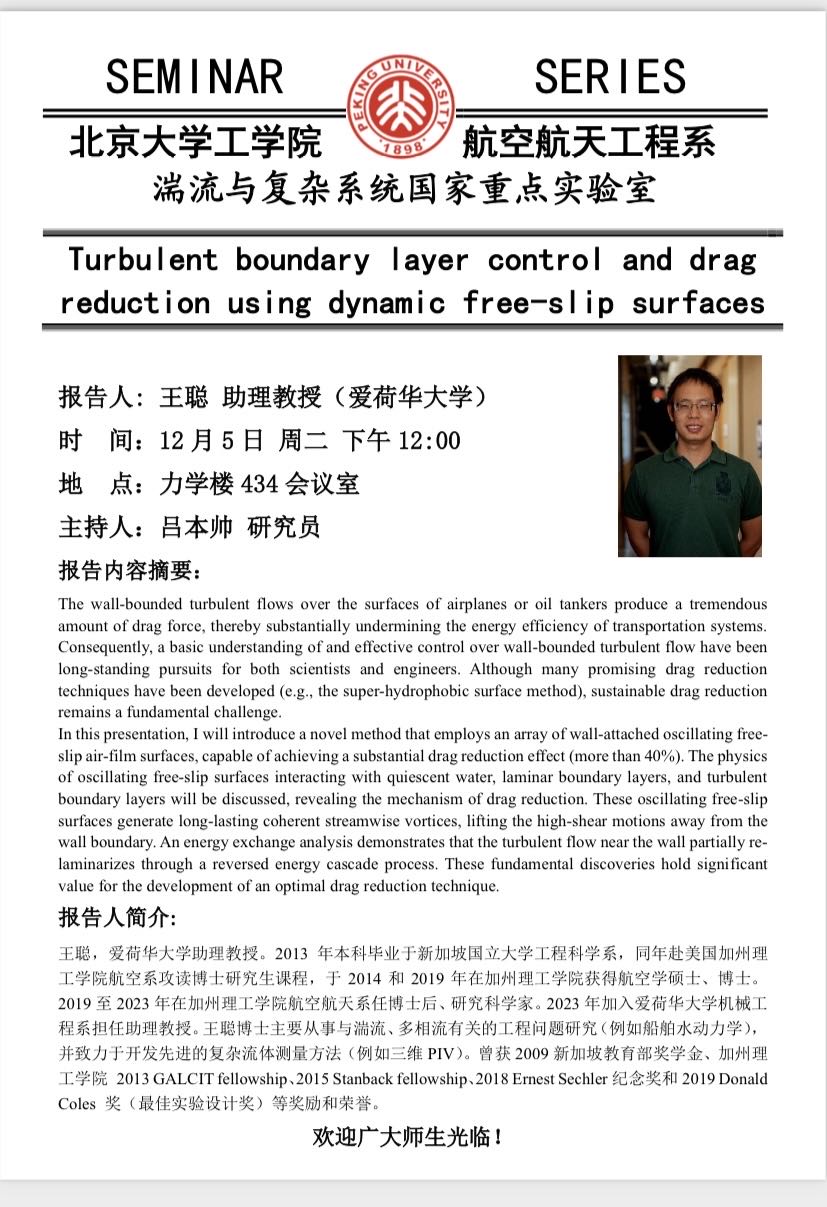 航空系学术报告【12.5王聪】:Turbulent boundary layer control and drag reduction using dynamic free-slip surfaces
