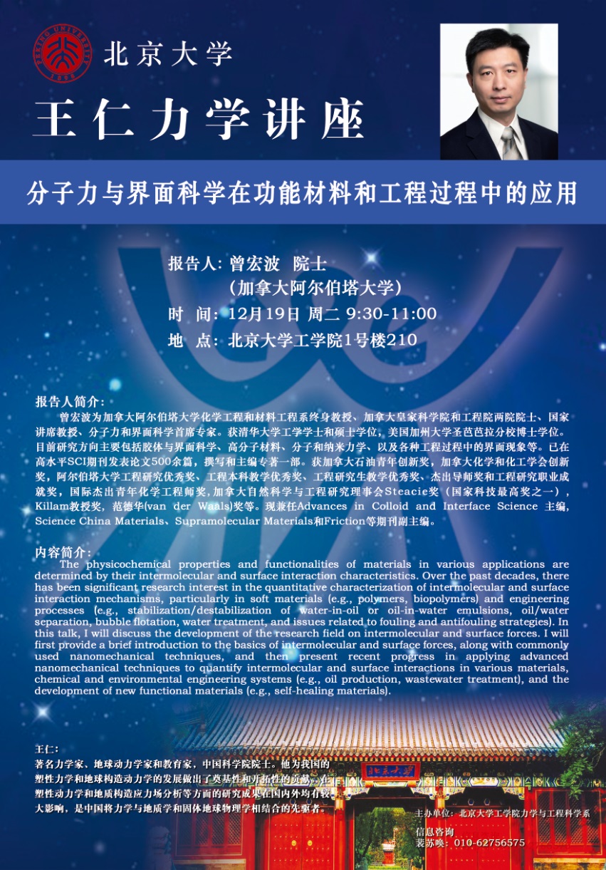 王仁力学讲座【12.19曾宏波】:分子力与界面科学在功能材料和工程过程中的应用