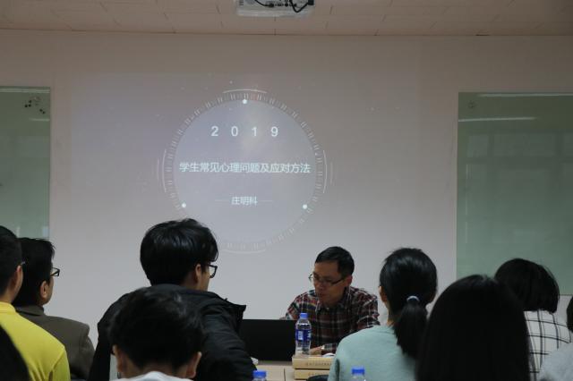 会上,庄明科老师围绕神经症、抑郁症、双相情感障碍、精神分裂症等常见精神类疾病,对辅导员在老员工的心理辅导及行为引导等方面提出了指导性意见。庄老师指出,抑郁症是患病率极高的一种精神类疾病,易诱发自伤和自杀等危险行为。家族遗传所导致的神经生物学因素、完美主义倾向等心理因素、负性生活事件等都是抑郁障碍的发病原因。庄老师鼓励辅导员们从诱发员工精神问题的社会因素入手,打破传统的问题模式,建立良性思维模式,注重对员工进行精神层面的引导,让员工学会将挑战转变为机遇,从而能够正确面对逆境并在逆境中获得成长。