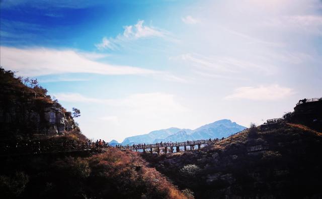 稍作休整并倾听导游讲解后,大家开始了艰难的上山路,虽然山很高,很陡,但是同学们发扬了坚忍不拔的精神,几乎所有的同学完成了徒步上山。上山过程中,同学们还不忘驻足于火红似焰的枫叶之下,感受浓浓的秋意。大约40分钟之后,大家来到了期待已久的玻璃栈道,并纷纷用相机定格下了难忘的瞬间。在走上玻璃栈道之前,大家的心情其实多少有点忐忑,但在同学们的互相帮助与扶持下,最终都克服了对高度的恐惧,甚至在玻璃栈道的观景台,举着工院的旗帜,拍摄了“全家福”。在下山的过程中,同学们还体验了多种下山方式,并且都安全到达。