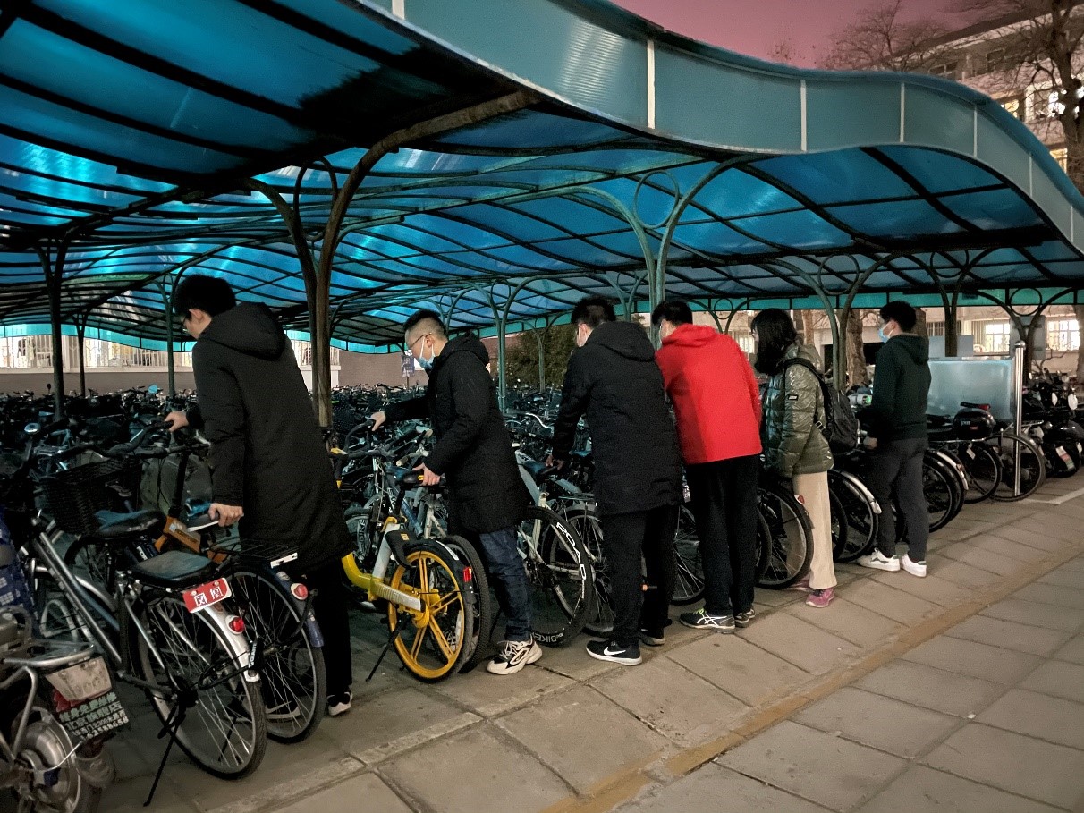 晚上7:30,班级同学自发到宿舍楼下参与码放自行车志愿活动。在志愿中成长,以小事共进步,在日常生活中贡献自己的青春力量。