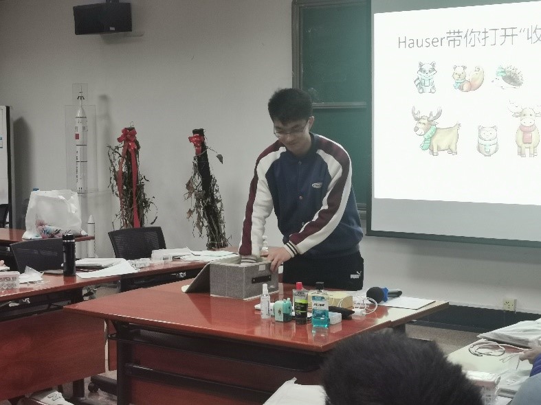 最后,董豪泽同学展示了多种常见的收纳技巧。在介绍之前,他首先指出收纳的重点在于物归原处。以提前准备的多种日用物品为例,董豪泽同学现场为同学们示范了利用收纳盒整齐放置杂物的方法。从耳机线与充电线的捆绑技巧,到空间最大化利用技巧,他都一一为同学们做出了示范。而后,利用提前准备的衣物,董豪泽同学向同学们演示了整理各类衣物的方法。通过他的讲解,同学们都表示受益颇深,并纷纷利用身边的外衣来进行练习。班委也为每一位同学准备了收纳盒,以便同学们将所学的知识运用到生活之中。