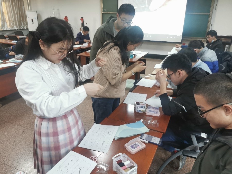 首先,林闽淇和祝易珂首先向同学们介绍了几种缝纫技巧。通过观看视频并倾听二位同学的讲解,同学们对缝纫的基本针法有了初步的了解。在这之后,为了让同学们切实掌握并体验所学习的技能,班委为同学们下发了提前准备的针线和布块,让同学们在亲身实践中巩固与提高所学技能。在这个过程中,二位同学走下讲台,仔细观察每位同学的操作,为同学们做出示范并解答疑惑。同学们纷纷动起手来,开始实践缝纫技能。虽然很多同学都是第一次做针线活,但是大家热情十分高涨,学习劲头十足。通过这次活动,同学们也掌握了缝纫的基本手法和技巧,本次活动也为同学们未来自主缝补衣物打下了技能上的基础。