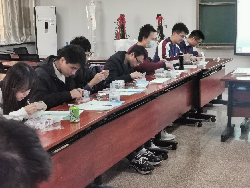 而后,借缝纫活动中大家遇到的打结问题为切入点,辅导员翟锦鹏向同学们展示了几种实用的打结方法。首先,他强调了学习打结的重要性:打结技巧不仅是一项生活技能,更是一项重要的求生技能。在火灾、地震等意外情况发生时,熟练掌握绳结有助于同学们尽快逃离危险地区。随后,辅导员为同学们发放了相关步骤图例,并就每一种绳结的详细操作给出示范。通过观摩演示,同学们使用班委发放的绳子进行模仿,在动手操作的过程中逐步掌握了多种绳结的系法。