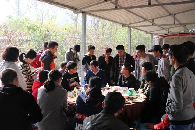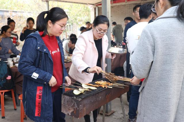 中午,大家进行了自助烧烤。同学们亲自动手,体验了被烟熏得泪眼汪汪的感觉,更感受到了自给自足的快乐;同学们在烧烤时互相帮助,递酱料,翻烤串,指导毫无经验的同学如何操作,增进了交流、培养了深厚的友谊。
