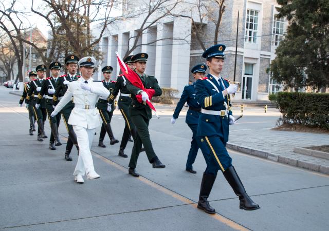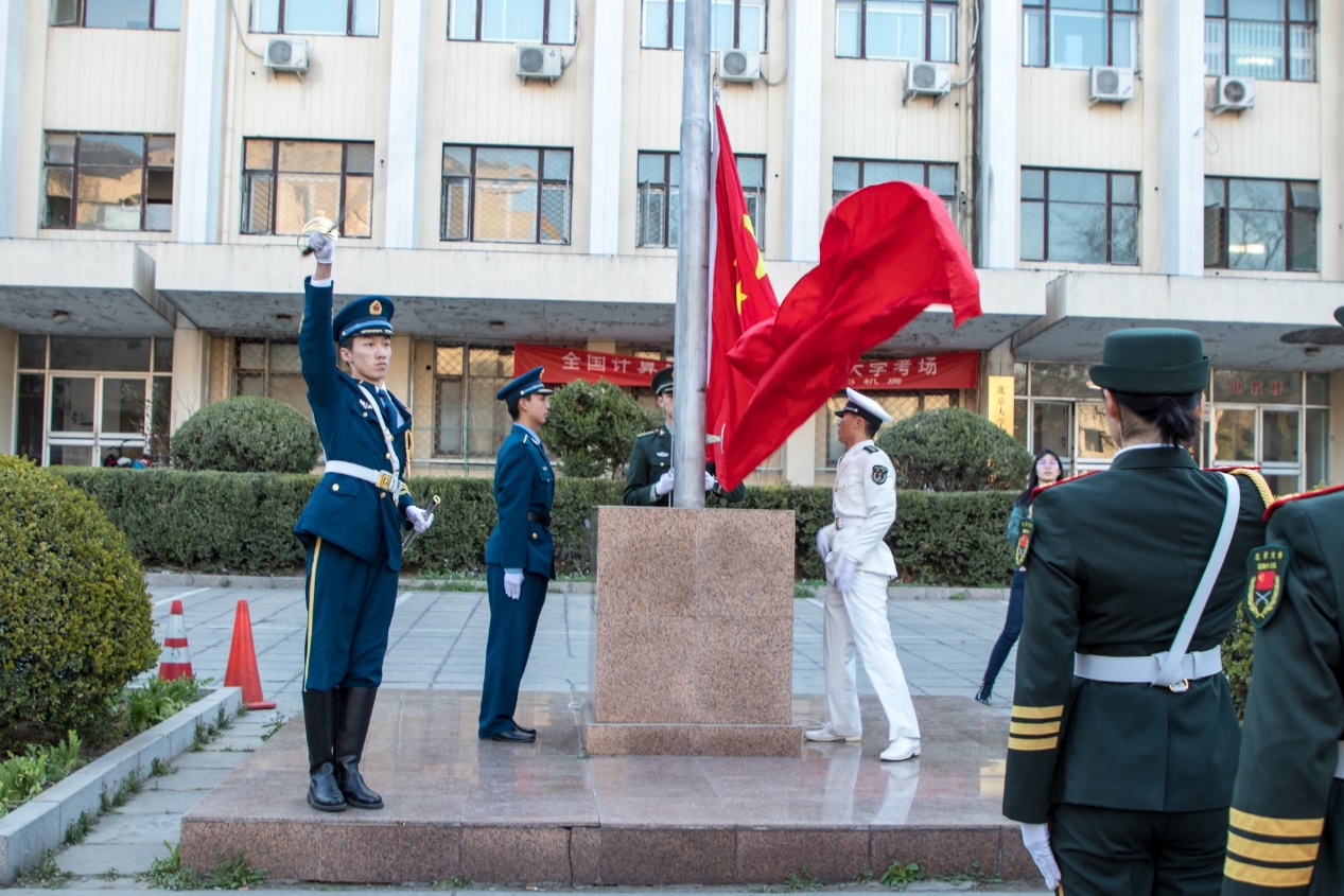早7点,升旗仪式正式开始,国旗护卫队精神昂扬,踏着整齐划一的步伐行进到升旗台。伴随着雄壮的国歌响起,五星红旗冉冉升起。初升的太阳照映国旗熠熠生辉,全场人员肃立,行庄严的注目礼。